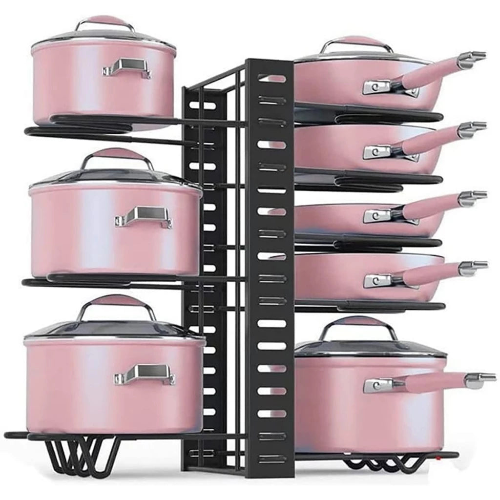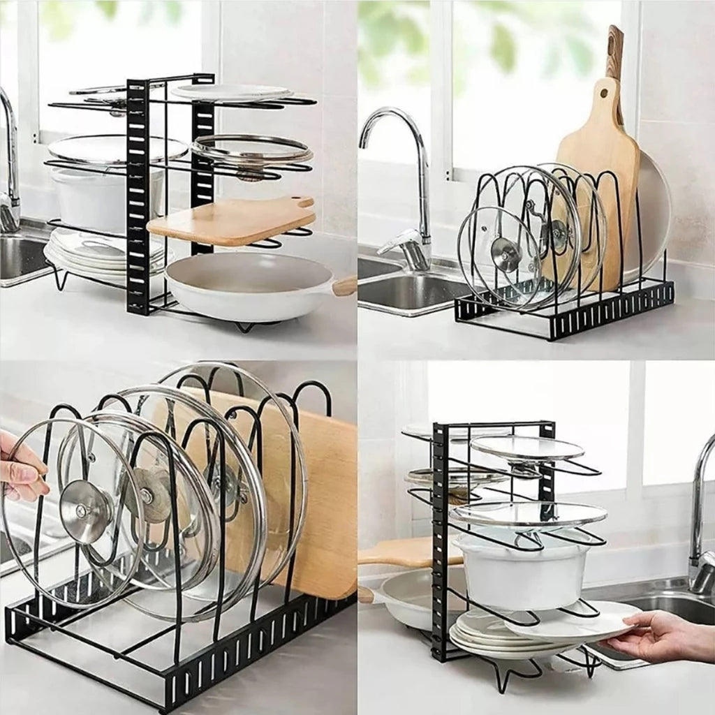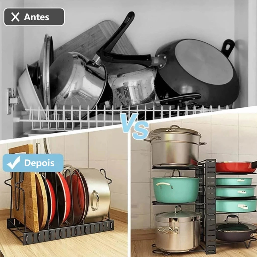 Multiuso: O porta-panelas é ideal para organizar panelas, frigideiras, tampas, assadeiras, panelas, tábuas de corte, bandejas, frigideiras, travessas e outros utensílios de cozinha na cozinha, armários, bancadas e despensa. Você pode encontrar e recuperar os itens desejados com rapidez e facilidade. Deixe sua cozinha menos bagunçada e sua vida mais fácil.